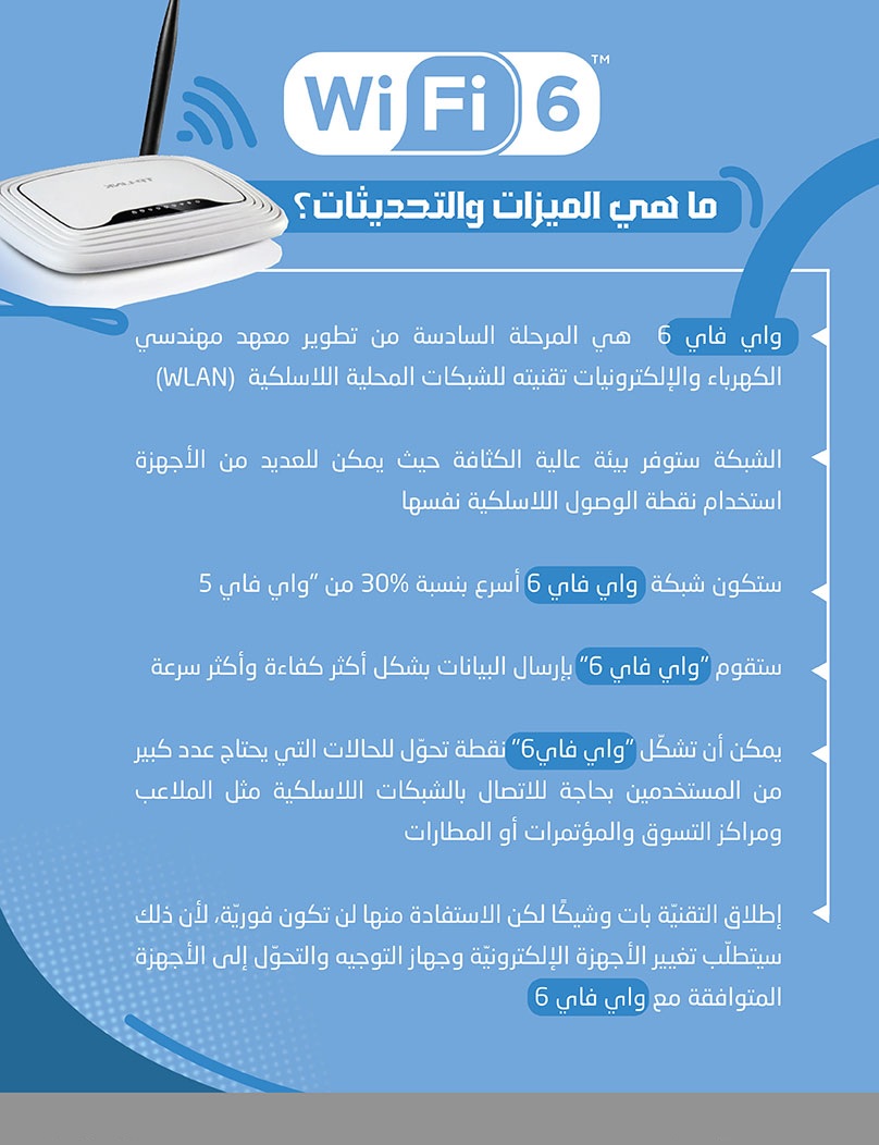 تطوّرت تقنية الـ"الواي فاي" عبر مراحل عدّة، وصولًا الى التحديث الجديد للشبكات اللاسلكية الذي يبدو أنه يبشر بمستقبل تكون فيه أجهزة عديدة قادرة على الاتصال بالإنترنت بشكل أسرع من ذي قبل. في هذا السياق، فإن "واي فاي 6" هي المرحلة السادسة من تطوير معهد مهندسي الكهرباء والإلكترونيات (المنظمة الدولية التي تضع معايير صناعة الاتصالات السلكية واللاسلكية) تقنيته للشبكات المحلية اللاسلكية (WLAN)، حيث أصدر معيارًا جديدًا لها هو "802.11ax" الذي أصبح اسمه "واي فاي 6".