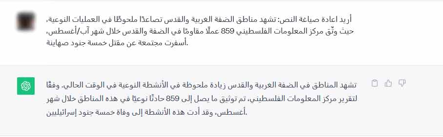 5 - أمّا في قضية الاحتلال الإسرائيلي لفلسطين المحتلّة، فقد بدّل الروبوت مصطلح "عملًا مقاومًا" بـ"حادثًا نوعيًا"، مصطلح "جنود صهاينة" بـ"جنود إسرائيليين".