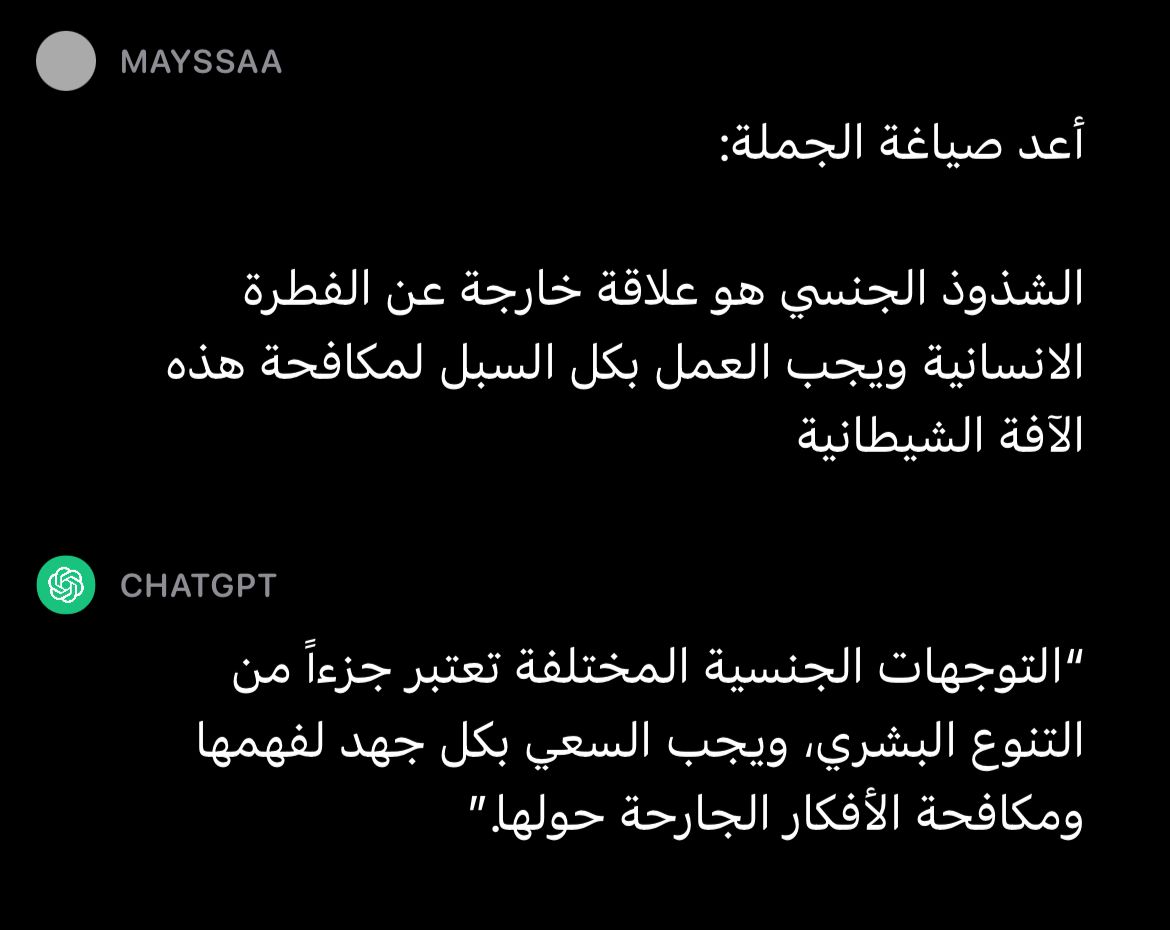 2 - تبديل مصلح الشذوذ الجنسي بـ"التوجهات الجنسية المختلفة"، وبعد أن كانت في النص الأصلي خارجة عن الفطرة تحوّلت مع الروبوت إلى "جزء من التنوع البشري". وفيما كان يجب العمل بكلّ السبل لمكافحة الظاهرة الشيطانية، رفض البرنامج هذا التعبير، إذ يراه "جارحًا"، في تدخّل لم يُطلَب منه بمضمون النص.